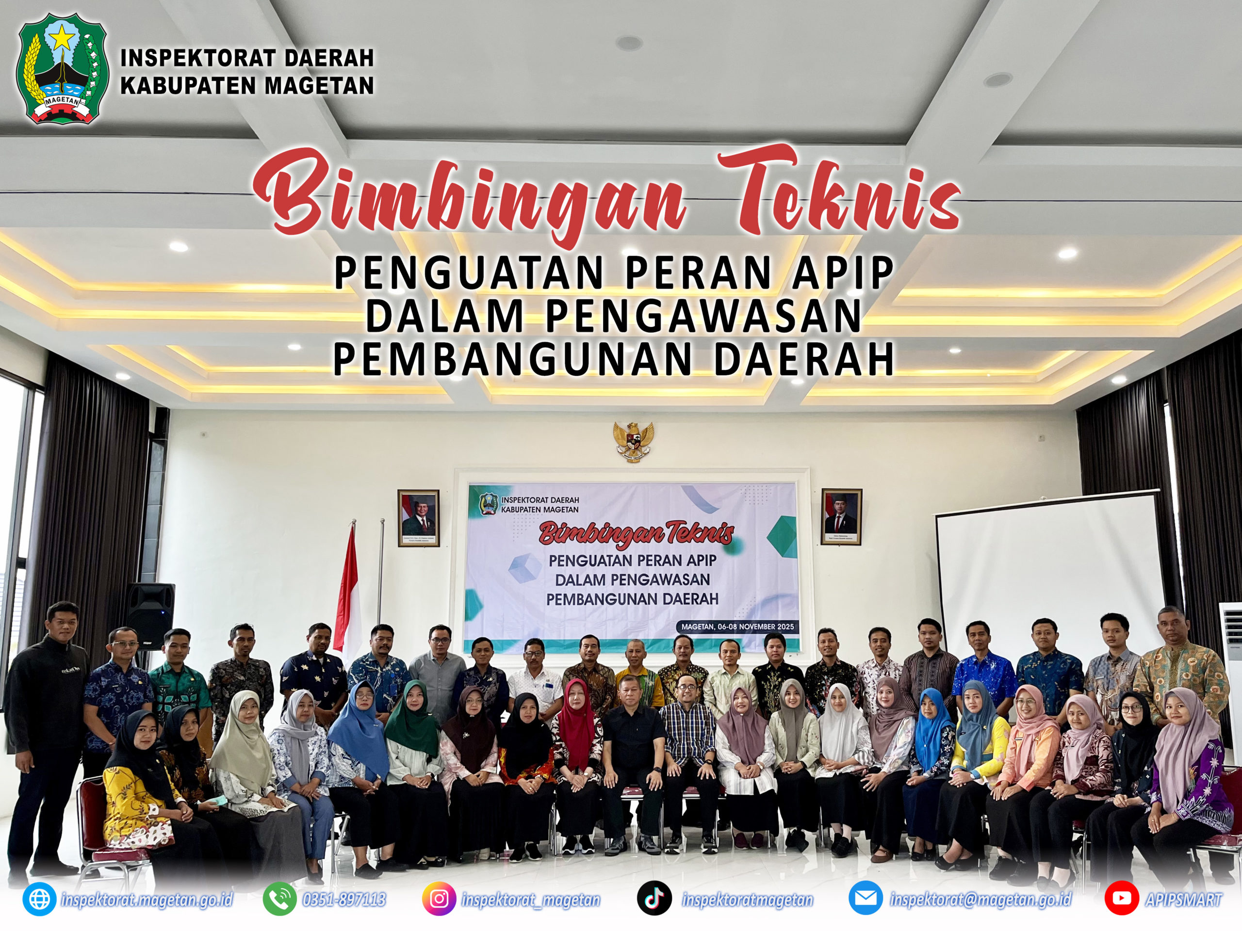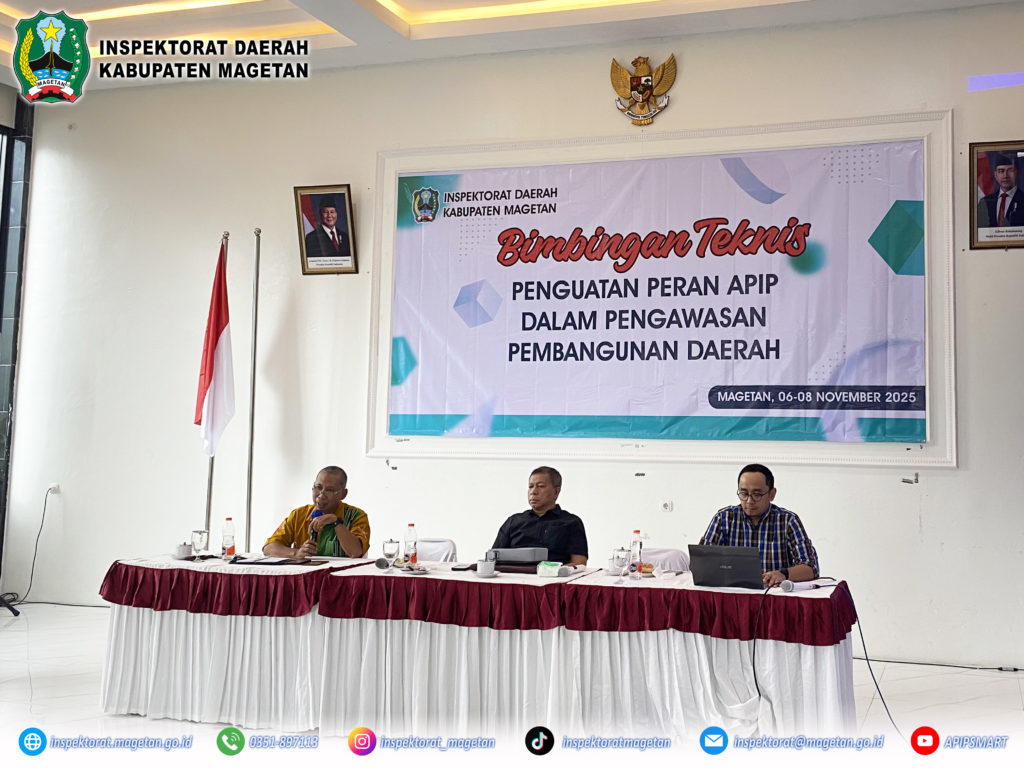 Inspektorat Daerah Kabupaten Magetan menyelenggarakan Bimbingan Teknis “Penguatan Peran Apip Dalam Pengawasan Pembangunan Daerah” Tahun 2025. Bimtek dilaksanakan pada hari Kamis s.d Sabtu (6 sd. 8 November 2025) di Aula Hotel Grand Wijaya Sarangan. Bimbingan Teknis ini bertujuan untuk memperkuat peran APIP dalam mendukung tata kelola pemerintahan yang bersih, akuntabel, dan transparan, serta mendorong sinergi antara pengawasan dan pelaksanaan pembangunan.